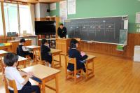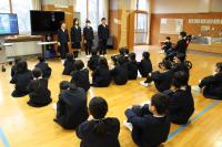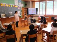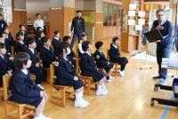 1年 「給食指導」 今日から始まる給食の時間のマナーや約束について、担任、栄養教諭、養護教諭から話を聞きました。