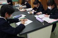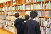 「図書館オリエンテーション」 新年度にあたって、改めて図書館の利用の仕方を学びました。図書館で本がどのように配置されているかを知り、実際に指定された種類の本を探す活動も行いました。