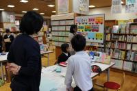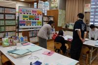 1年 「図書館オリエンテーション」 本の借り方を習いました。担任の先生がお手本になっています。