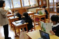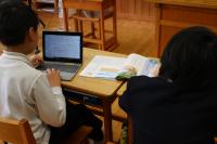 4年 道徳「どっちがいいか」 資料を読んで自分の考えを端末に入力しています。