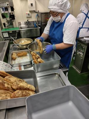 普段の給食では決して組み合わせない、魚のフライとフライドポテトですが、今日は特別にニュージーランドの「フィッシュ&チップス」を再現しました