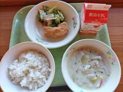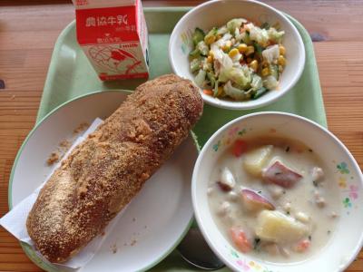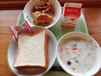 今日の献立は「きな粉揚げパン、ツナサラダ、秋のシチュー、牛乳」です。