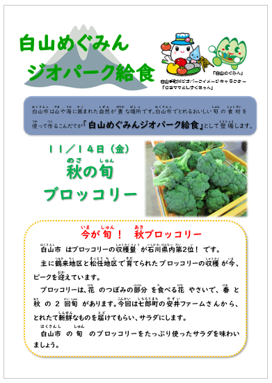 白山市地産地消課の協力で、地場産物を味わう白山めぐみんジオパーク給食です