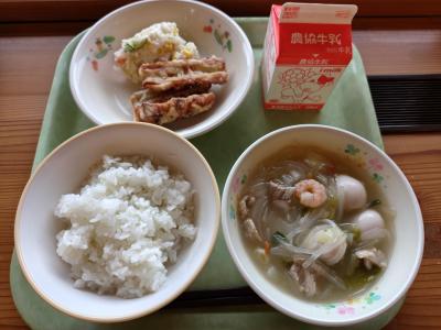 献立は「ごはん、ちくわの天ぷら、ポテトサラダ、太平燕(タイピーエン)、牛乳」でした。