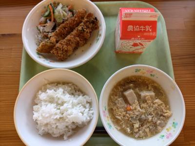 今日の献立は「ごはん、鰯のごまフライ、ゆかり和え、高野豆腐の卵とじ、牛乳」でした