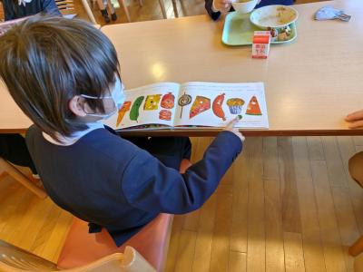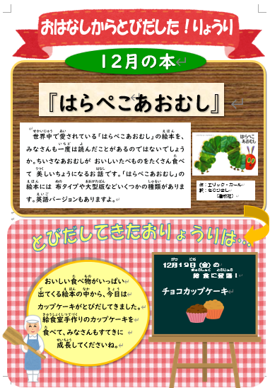 今月の「お話しから飛び出した料理」は、みんな大好きエリック・カールの「はらぺこあおむし」です