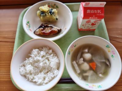 今日の献立は「ご飯、ふくらぎの照り焼き、黒豆入りきんとん、白玉雑煮、牛乳」のお正月料理です