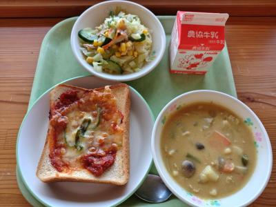 今日の献立は「ピザトースト、ツナサラダ、カレーシチュー、牛乳」です。