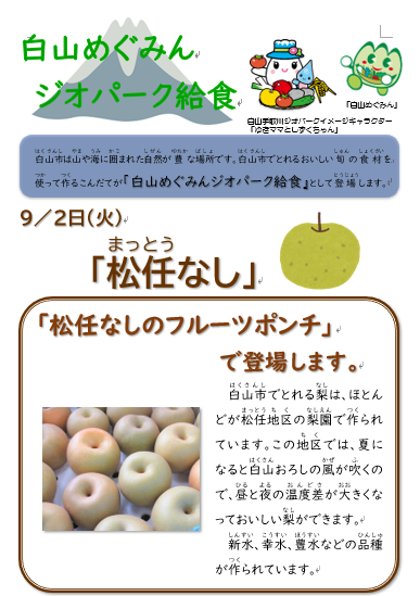 今日の献立は、市地産地消課のご協力で今が旬の松任梨を使った「白山めぐみんジオパーク給食」です。