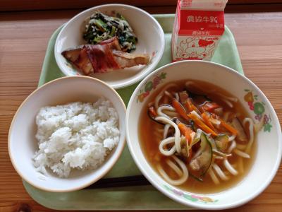 今日の献立は「ご飯、牛乳、鮭のベーコン巻き、磯辺和え、冷やしうどん汁」です。