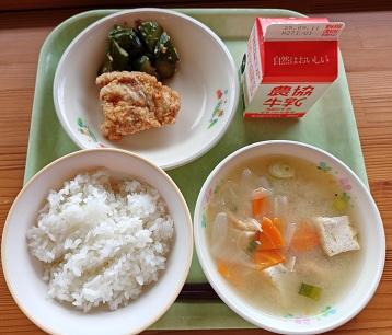 今日の献立は「ご飯、鶏のからあげ、きゅうりのピリ辛、じゃがいものみそ汁、牛乳」です。