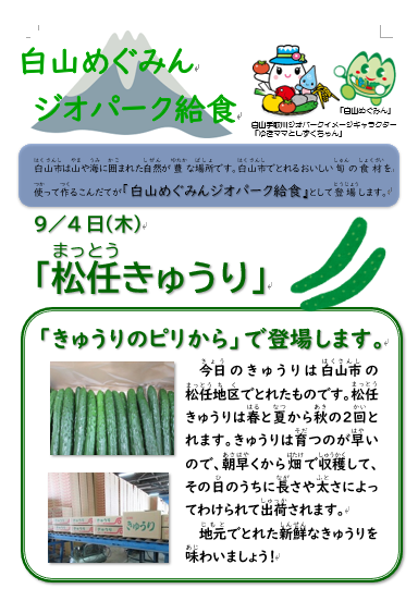 そして今月2回目の、白山市の地場産野菜をいただく「白山めぐみんジオパーク給食」です。
