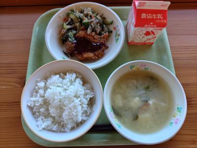 今日の献立は「ご飯、とんかつ、ひじきとごぼうのサラダ、豆腐のみそ汁、牛乳」です。