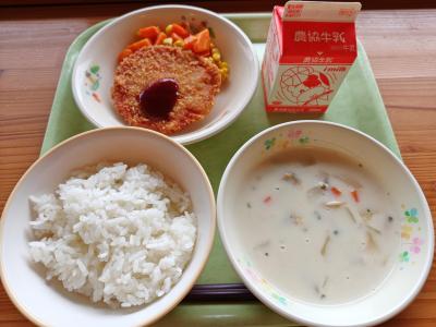 今日の献立は「ご飯、ハムカツ、にんじんグラッセ、クラムチャウダー、牛乳」です。