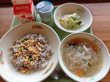 今日の献立は「金時草のそぼろ寿司、野菜のぴり辛和え、冬瓜のスープ、フローズンヨーグルト、牛乳」です。