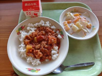 今日の献立は「麦ごはん、バターチキンカレー、フルーツラッシー、牛乳」です。