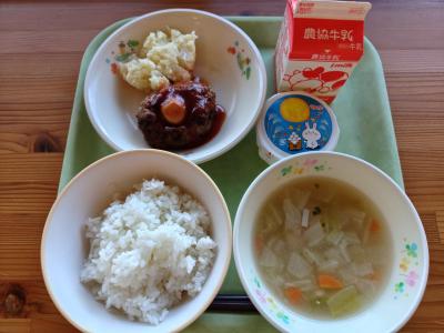 今日の献立は「ごはん、お月見ハンバーグ、クリームドポテト、ABCスープ、お月見デザート、牛乳です」