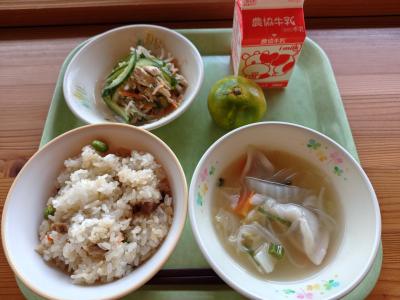 今日の献立は「中華おこわ、バンバンジーサラダ、水ぎょうざ、みかん、牛乳」です。