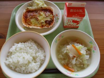 今日の献立は「ごはん、堅とうふのジオグラタン、クリームドポテト、コンソメジュリアン」です。