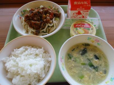 今日の献立は「ごはん、ジャージャー麺、コーンかき玉スープ、パインゼリー」です。
