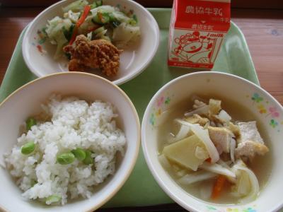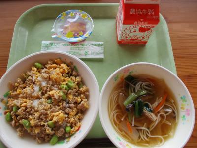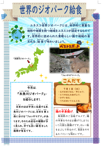 今月の世界ジオパーク給食は「糸魚川ジオパーク」です。献立は「枝豆ご飯、鶏の半身揚げ風、ひすい和え、打ち豆入り豚汁、牛乳」です。
