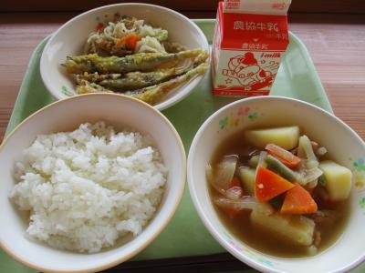 今日の献立は「ご飯、ししゃものカレー揚げ、ごま酢和え、肉じゃが、牛乳」です。