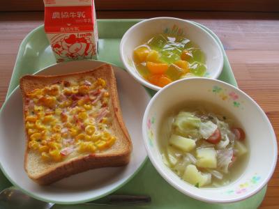今日の献立は「ハムコーンパン、野菜のスープ煮、フルーツカクテル、牛乳」です。