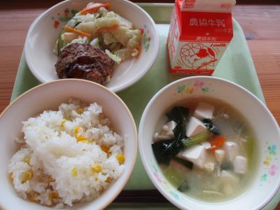 今日の献立は「コーンご飯、照り焼きハンバーグ、コールスローサラダ、とうふのみそ汁、牛乳」です。