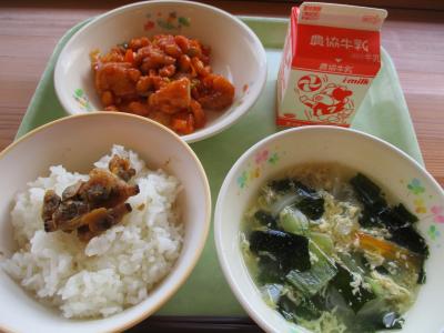 今日の献立は「ご飯、鶏肉と大豆の甘酢炒め、卵とわかめのスープ、あさりの佃煮」です。