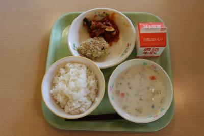 今日の献立は「ご飯、鶏肉の香草パン粉焼き、ラタトウイユ、玉ねぎたっぷりクリームスープ、牛乳」です。