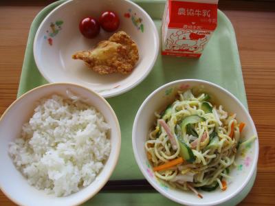 今日の献立は「ご飯、フライドチキン、ミニトマト、冷やし中華、牛乳」です。