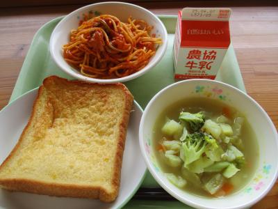 今日の献立は「フレンチトースト、スパゲティナポリタン、カレースープ煮、牛乳」です。