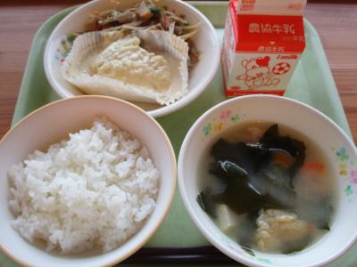 今日の献立は「ごはん、魚のマヨネーズ焼き、きんぴらごぼう、じゃがいもとわかめのみそ汁、牛乳」です。