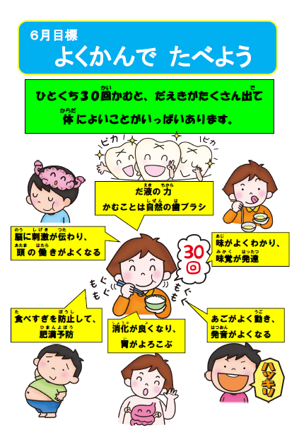 今月の給食目標は「よくかんで食べよう」です。そして午前中には歯科検診がありました。