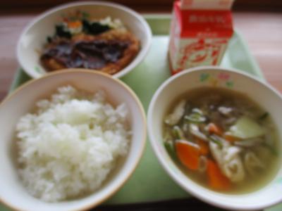 今日から「歯と口の健康週間」が始まりました。そこで、よく噛んで食べるための献立「ごはん、みそカツ、はりはり和え、鶏ごぼう汁」にしました