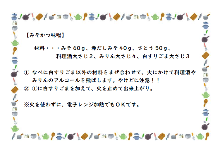 みそカツのみそが好評で2年生のMさんから、レシピを教えて!!と、リクエストがありましたので、ご紹介します