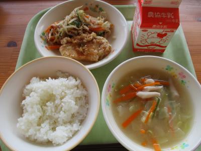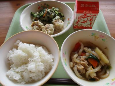 今日の献立は「ごはん、ユーリンチー、もやしとハムのあえもの、中華スープ、牛乳」です。