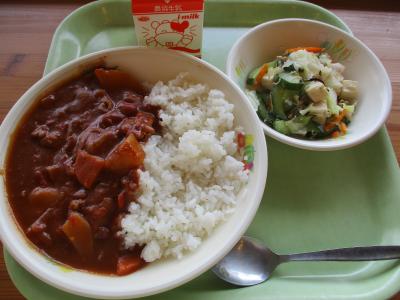 今日の給食は「トマトのハヤシライス、豆腐とじゃこのサラダ、牛乳」です。