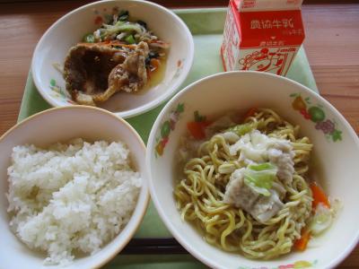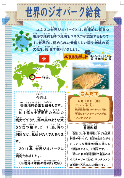 今日は世界ジオパーク給食「香港地質公園」です。献立は「ごはん、焼き豚風揚げ豚のはちみつだれ、青菜のオイスターソース炒め、ワンタン麵、牛乳」です。