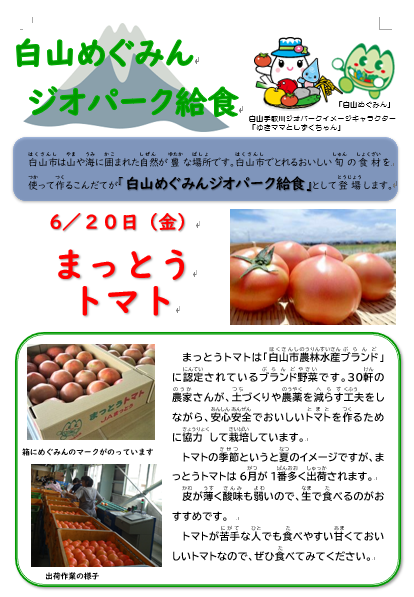 今日は白山市でとれるおいしい旬の食材を使った「白山めぐみんジオパーク給食」です。