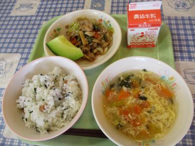 今が旬の「まっとうトマト」を使った献立「大豆わかめごはん、ホイコーロー、まっとうトマトのサンラータン、メロン」です。