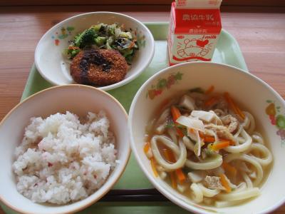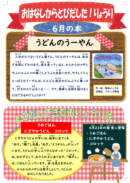 今日は絵本から飛び出した料理で、本の題名は「うどんのうーやん」です。「うどんのうーやん」のどんぶりに、豆腐や油揚げなど沢山の食材が入った「にぎやかうどん」は普段のうどんとは違ったおいしさで、絵本の世界感もあわせて美味しく味わってもらえたようです