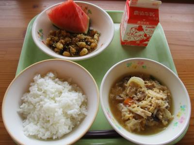 今日の献立は「ご飯、大豆のカレーがらめ、高野豆腐の卵とじ、小玉すいか」です。