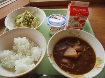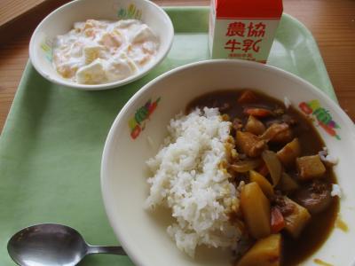 今日の献立は「ポークカレー、フルーツヨーグルト、牛乳」です。