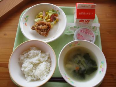 入学、進級をお祝いしてみんなの大好きな立田揚げとデザートの献立で、お残し無しの完食でした