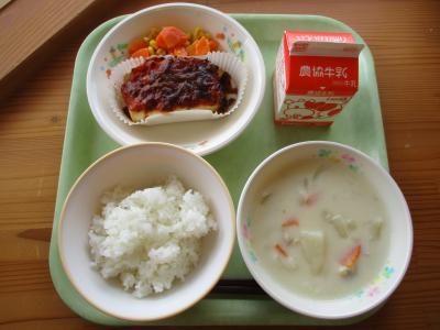 今日の献立は「ご飯、お豆腐ピザ、にんじんグラッセ、クリームシチュー、牛乳」です。
