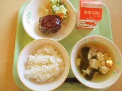 献立は「ご飯、ハンバーグ、マカロニ、紅白すまし汁、牛乳」です。