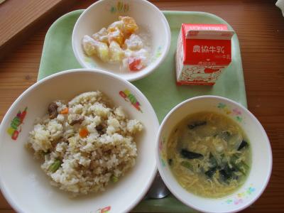 今日の献立は「五目チャーハン、コーンかき玉スープ、フルーツミルクゼリー、牛乳」です。