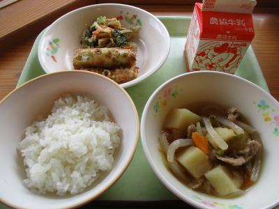 今日の献立は「ご飯、ちくわの磯辺揚げ、ごま和え、肉じゃが、牛乳」です。