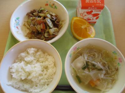 今日の献立は「ご飯、ホイコーロー、水ぎょうざスープ、オレンジ、牛乳」です。